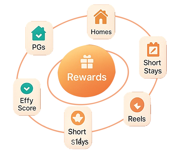 Orbit icons → Vibe banner → Reels → Effy Score → Rewards → PG/Home details → Short Stay model.